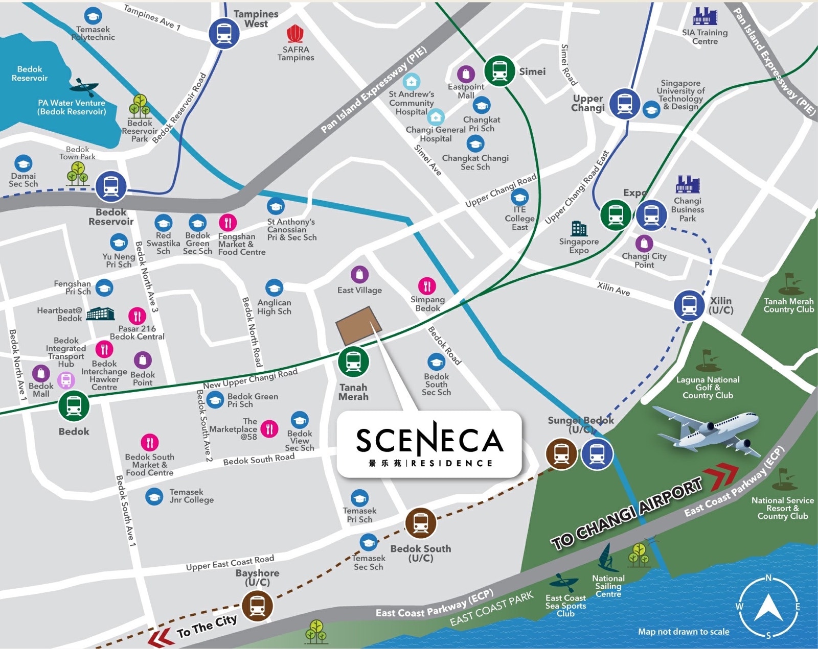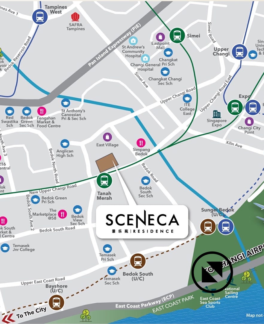 Sceneca Residence is near Changi Business Park, Bedok MRT Town Centre, Tampines Regional Centre, and Changi International Airport. Retail and F&B options at Eastpoint Mall, Bedok Mall, East Village, Simpang Bedok & Changi City Point, Jewel Changi Airport are easily accessible.